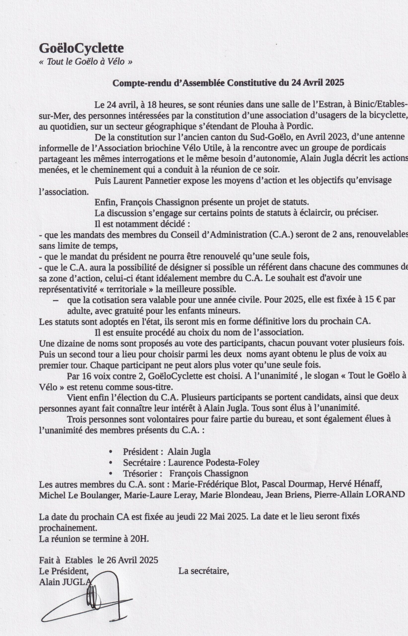 Issue de l’association briochine « Vélo Utile », et créée le jeudi 24 Avril 2025, Goëlocyclette compte près d’une centaine d’adhérents, de toutes origines et de tous âges mais tous animés du même intérêt : pratiquer le vélo au quotidien et en toute sécurité.